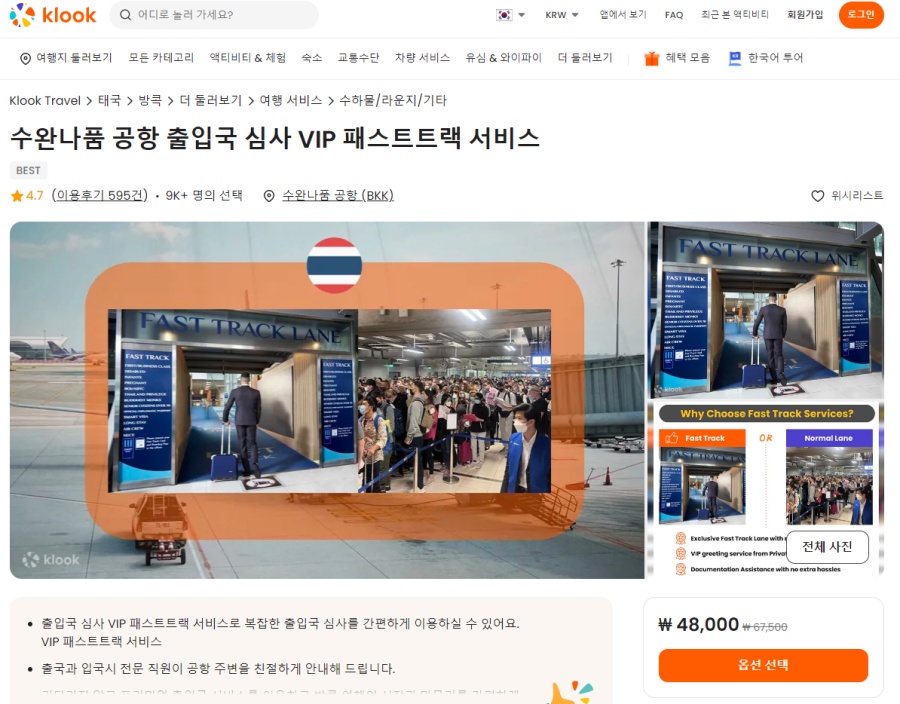 수완나품 공항 출입국 심사 VIP 패스트트랙 서비스는 클룩사이트에서 쉽게 예약하실 수 있으며, 현재 할인된 금액에 이용하실 수 있습니다.