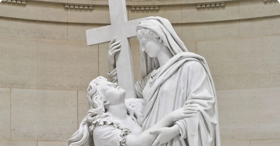 vV. 프랑스 조각가 장 피에르 코르토(Jean-Pierre Cortot)의 조각품 '종교 앞에 무릎을 꿇은 마리 앙투아네트'를 감상하세요.