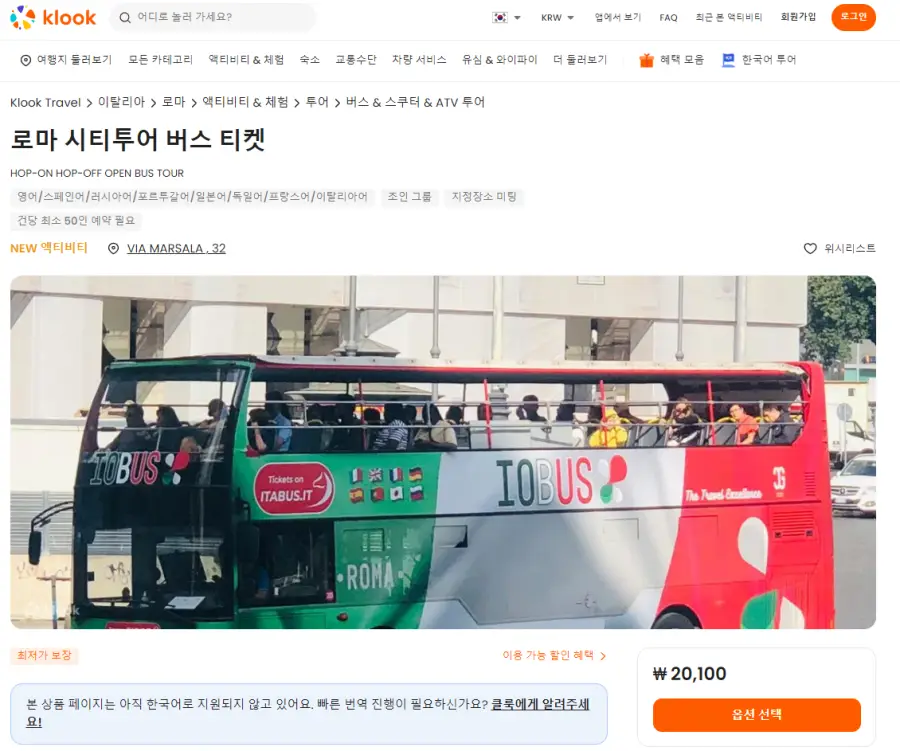 Hop-on Hop-off 투어 외에도 앱을 통해 특별히 만들어진 특별 투어 덕분에 혼자서 로마를 쉽게 여행하실 수 있습니다. 로마 시티투어 버스 티켓은 클룩사이트에서 쉽게 예약하실 수 있으며, 현재 할인된 금액에 이용하실 수 있습니다.