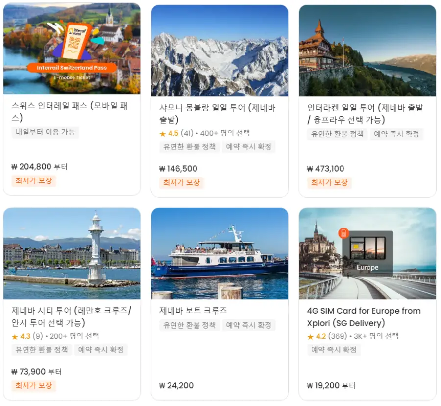 스위스의 평화로운 도시 제네바로 여행하면서 알프스에서 기억에 남을 모험을 즐기고, 아름다운 제네바 호수를 따라 경치 좋은 크루즈를 타고, 그림 같은 도시 안시를 방문하세요. 네 가지 흥미로운 패키지 옵션을 확인하고 가장 관심 있는 일정을 선택하실 수 있습니다.