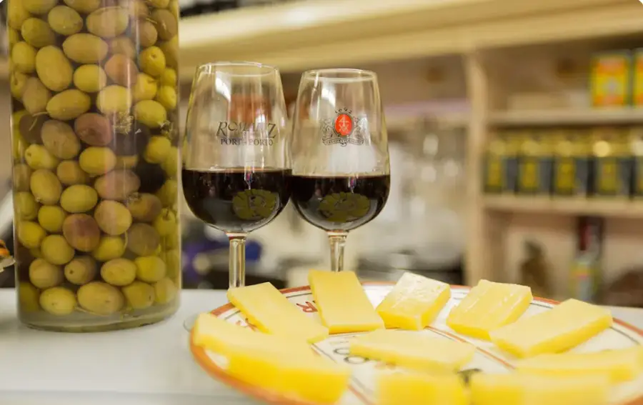 V. 맛있는 상 호르헤 치즈 한 조각을 곁들인 포르투갈의 유명한 강화 와인인 포트를 한 모금 마셔보세요.