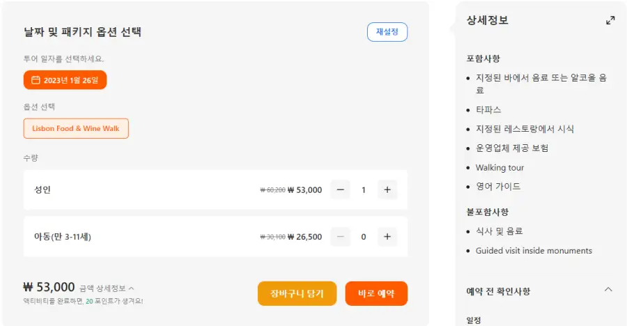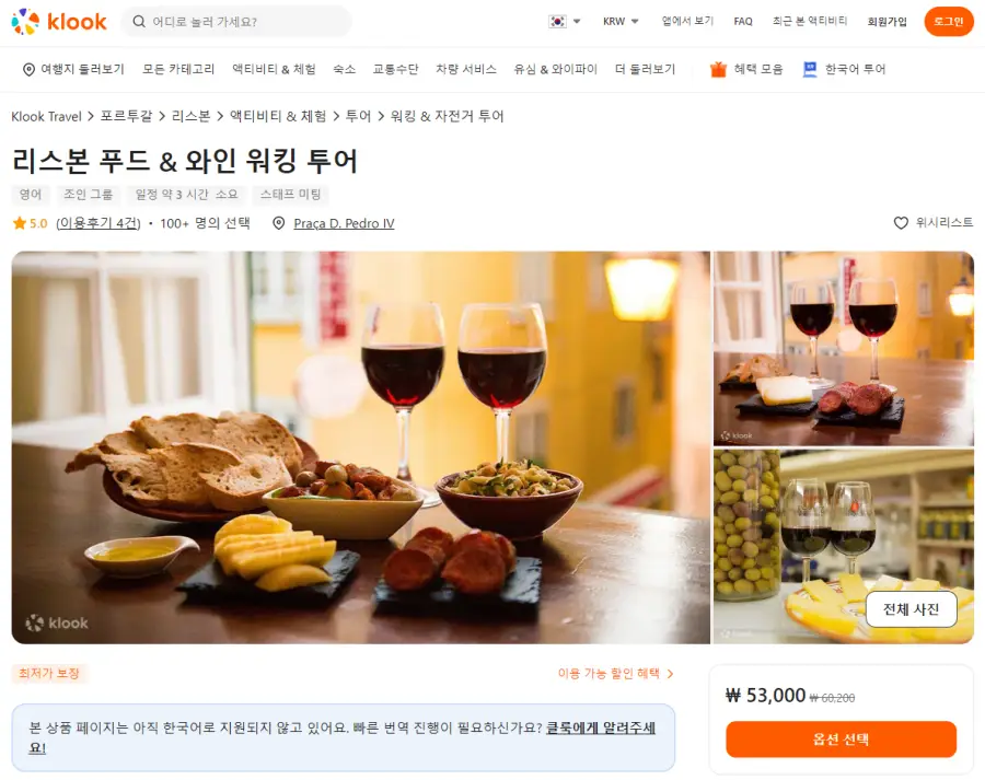 리스본 푸드 앤 와인 워킹 투어는 클룩사이트에서 쉽게 예약하실 수 있으며, 현재 할인된 금액에 이용하실 수 있습니다.