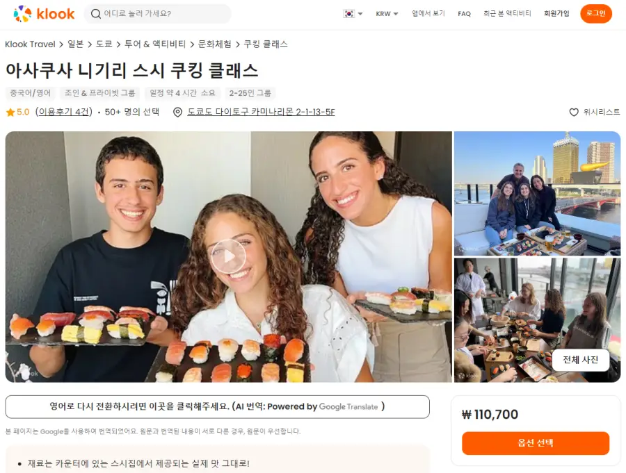 도쿄 아사쿠사 스시 니기리 체험은 클룩사이트에서 쉽게 예약하실 수 있으며, 현재 할인된 금액에 이용하실 수 있습니다.
