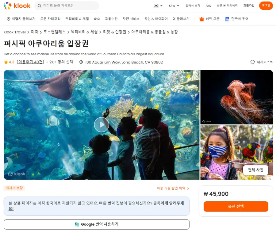캘리포니아 퍼시픽 아쿠아리움 입장권은 클룩사이트에서 쉽게 예약하실 수 있으며, 현재 할인된 금액에 이용하실 수 있습니다.