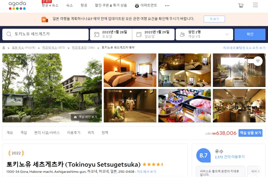 하코네 토키노유 세쓰게츠카 (Tokinoyu Setsugetsuka)의 최저 가격대는 아고다웹사이트에서 할인특가 가격으로 매일매일 변동되며 60만원대부터 다양하게 형성됩니다. 날짜별로 매일 가격이 다르므로 아고다웹사이트 최저가를 확인하시려면 아래 링크를 누르시고 원하는 날짜의 가격대를 선택해야 정확한 가격을 자세히 보실 수 있습니다.