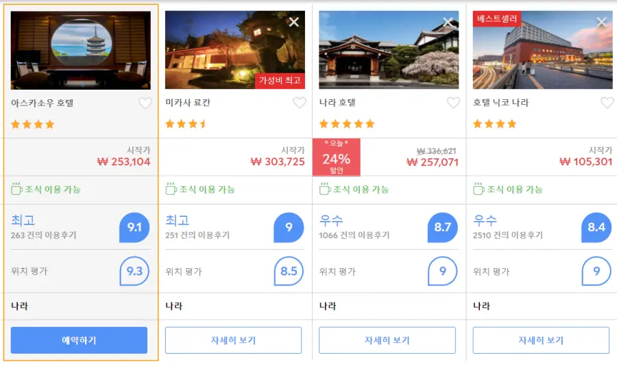 나라 아스카소우 호텔 (Asukasou Hotel)의 최저 가격대는 아고다웹사이트에서 할인특가 가격으로 매일매일 변동되며 20만원대부터 다양하게 형성됩니다. 날짜별로 매일 가격이 다르므로 아고다웹사이트 최저가를 확인하시려면 아래 링크를 누르시고 원하는 날짜의 가격대를 선택해야 정확한 가격을 자세히 보실 수 있습니다.