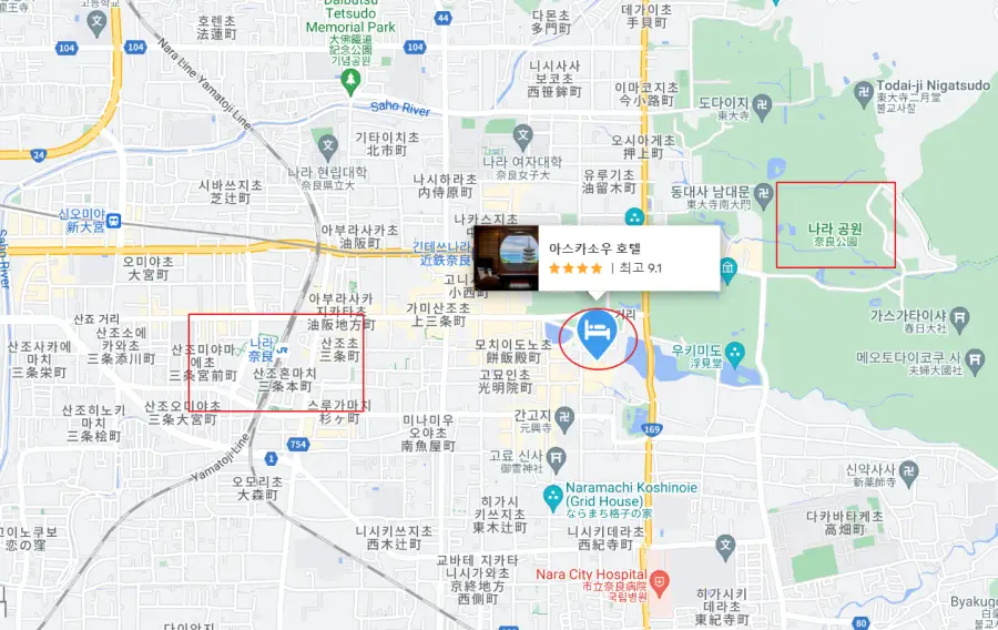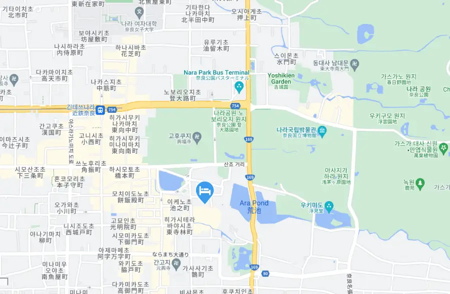 호텔의 위치는 나라 공원과 나라의 주요 관광지에 가까워, 여행객들에게 매우 편리합니다. 특히, 호텔 근처에는 세계 유산인 토다이지와 코후쿠지 등의 유명한 사찰이 있습니다.