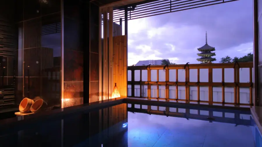 나라 아스카소우 호텔의 또 다른 특징은 큰 공용 목욕탕인 '온천'이 있습니다. 이 온천은 몸과 마음을 편안하게 해주는 효과가 있는 것으로 알려져 있습니다.