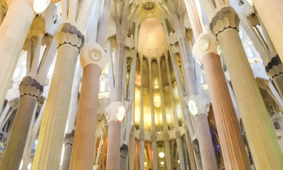 교회 내부는 높이 45미터의 중앙 네이브와 네 개의 사이드 네이브로 구성되어 있습니다. 중앙 네이브의 천장은 별이 빛나는 밤하늘을 상징하며, 기둥들 사이로 들어오는 빛은 교회 내부를 환하게 비춥니다. 이러한 디자인은 사그라다 파밀리아를 방문하는 사람들에게 성스러운 경험을 제공합니다.
