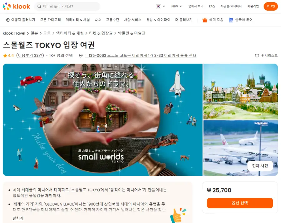 미니어쳐 테마파크 스몰월드 도쿄는 클룩사이트에서 쉽게 예약하실 수 있으며, 현재 할인된 금액에 이용하실 수 있습니다.