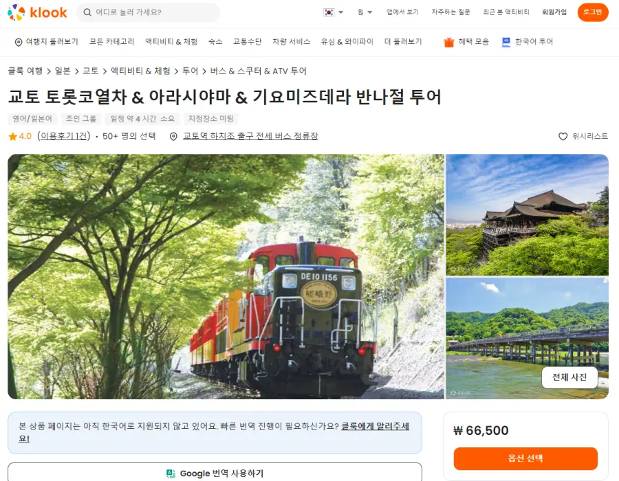 교토여행에 추천하는 토롯코열차이용 아라시야마, 기요미즈데라 현지투어는 클룩사이트에서 쉽게 예약하실 수 있으며, 현재 할인된 금액에 이용하실 수 있습니다. 투어내용은 항상 변경될 수 있으니 예약사이트에서 정확한 내용을 확인하셔야 합니다.