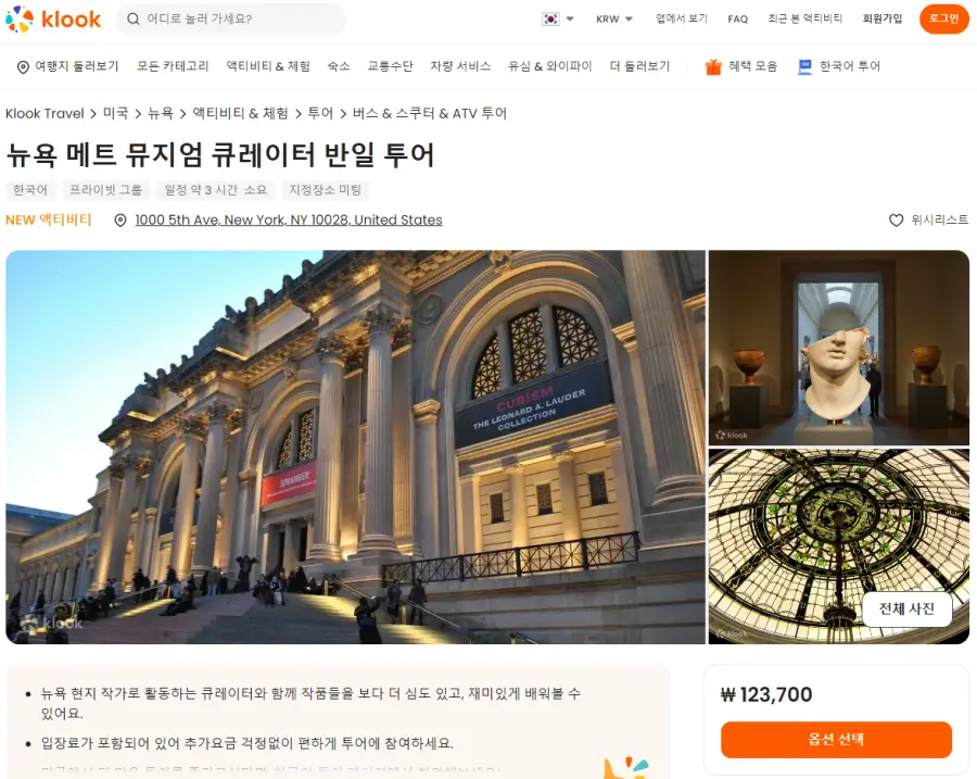 뉴욕 메트 뮤지엄 큐레이터 반일 투어는 클룩사이트에서 쉽게 예약하실 수 있으며, 현재 할인된 금액에 이용하실 수 있습니다.
