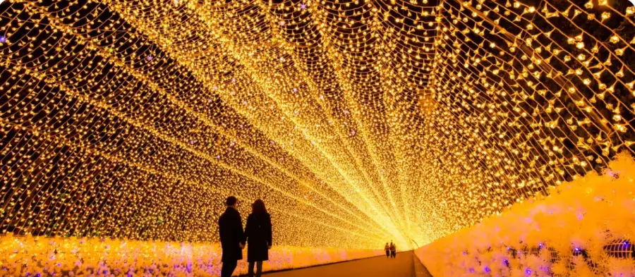 - 나바나노사토 윈터 일루미네이션의 가장 큰 특징은 100미터에 걸쳐 펼쳐지는 놀라운 빛의 터널입니다.