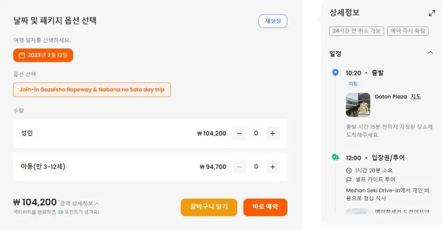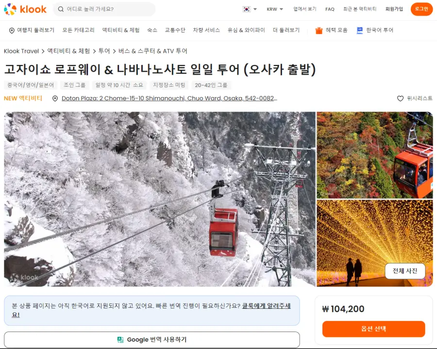 오사카 출발 고자이쇼 로프웨이와 나바나노사토 일일 투어는 클룩사이트에서 쉽게 예약하실 수 있으며, 현재 할인된 금액에 이용하실 수 있습니다.