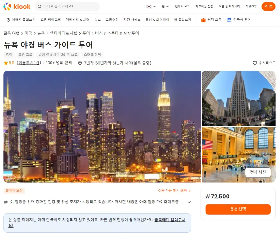 뉴욕 야경 버스 가이드 투어는 클룩사이트에서 쉽게 예약하실 수 있으며, 현재 할인된 금액에 이용하실 수 있습니다.