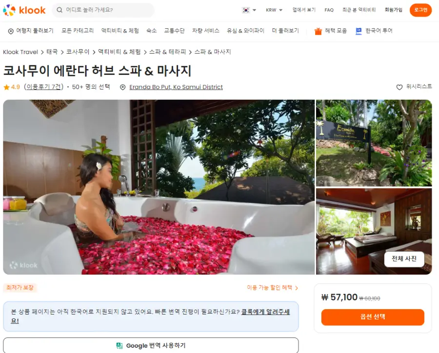 사무이섬 에란다 허브 스파 앤 마사지는 클룩사이트에서 쉽게 예약하실 수 있으며, 현재 할인된 금액에 이용하실 수 있습니다.