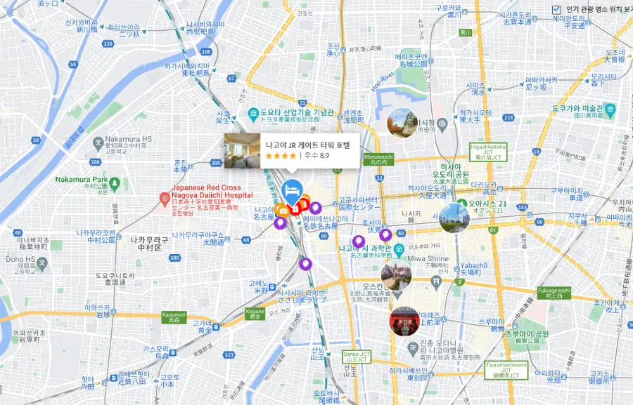나고야역에서는 나고야 성을 비롯한 여러 관광 명소로의 접근성이 좋습니다. 또한, 나고야역은 신칸센의 정차 역이기 때문에, 도쿄나 오사카 등 다른 도시로의 이동도 편리합니다.