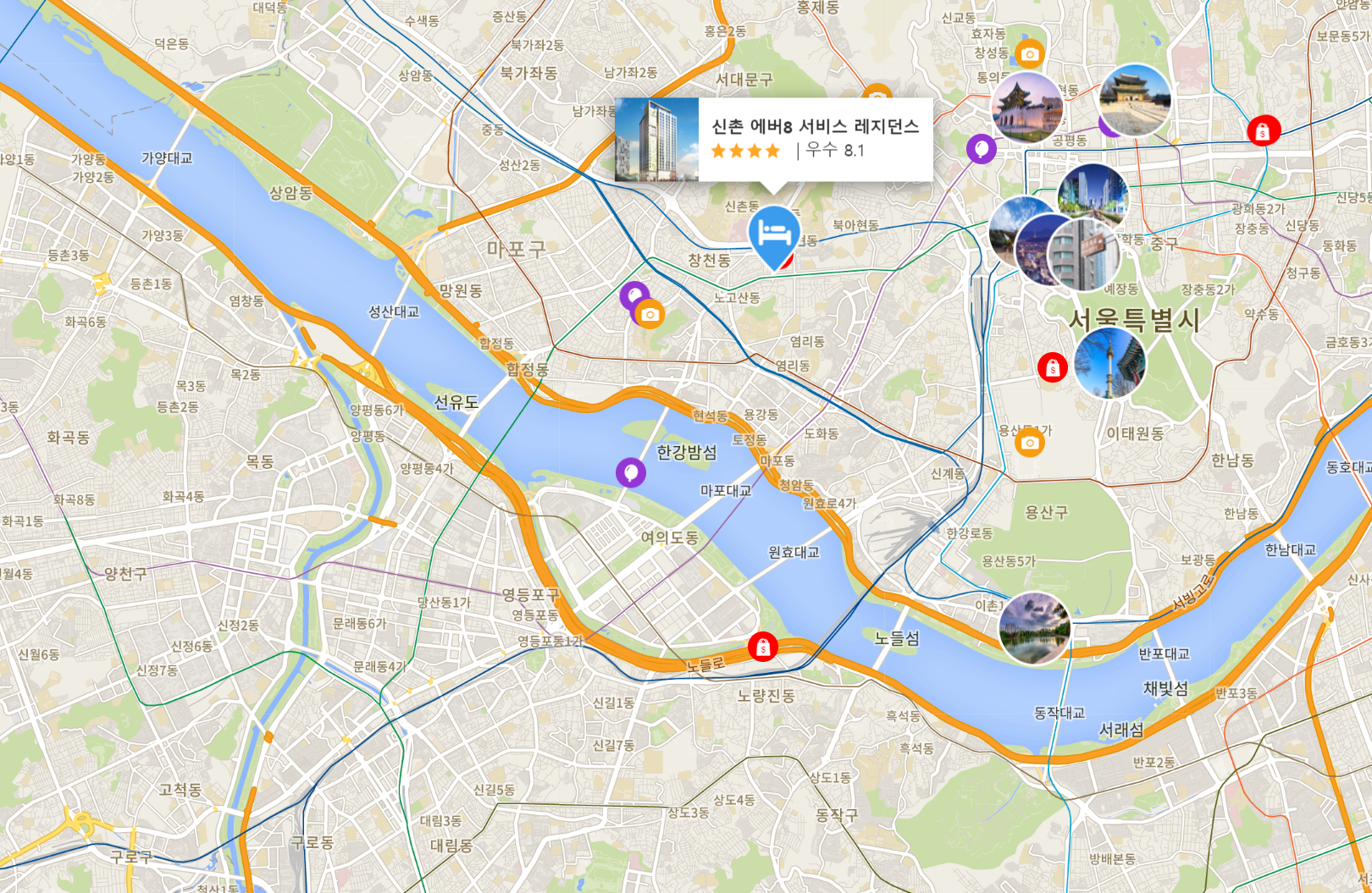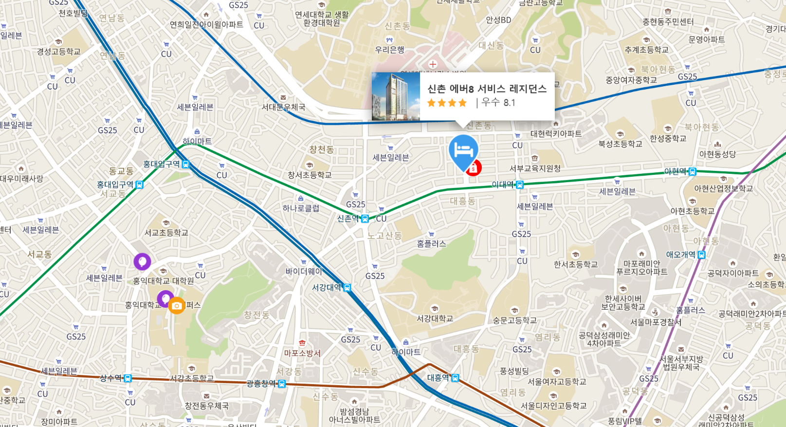 신촌 에버8 서비스 레지던스 (Shinchon Ever8 Serviced Residence)는 도보로 신촌역, 이대역으로 이동이 가능하며, 인천/김포공항 및 홍대, 광화문, 명동 등 서울 주요 관광지로의 접근성이 매우 편리합니다.