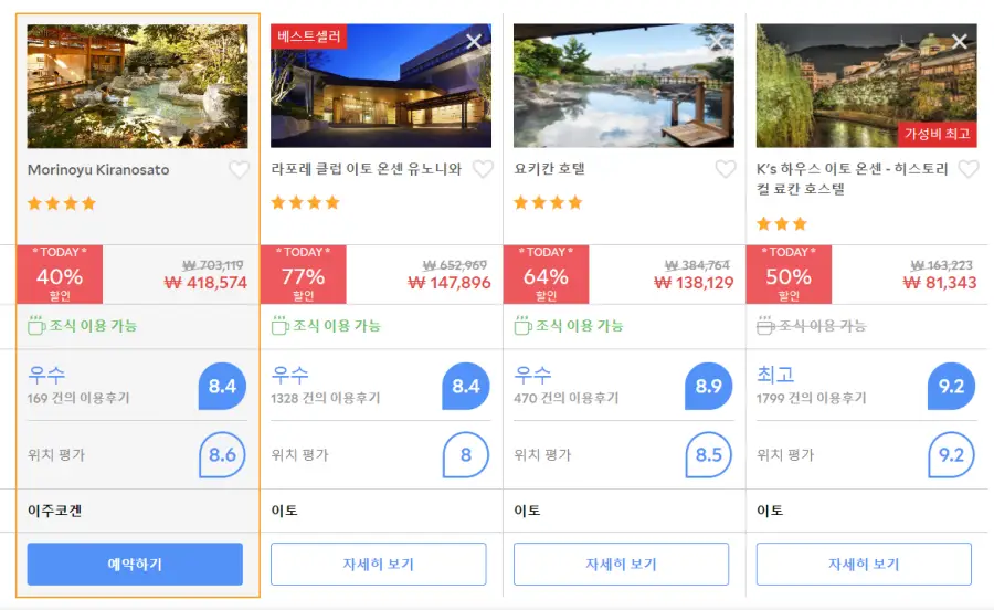 아타미온천 모리노유 키라노사토 (Morinoyu Kiranosato)의 최저 가격대는 아고다웹사이트에서 할인특가 가격으로 매일매일 변동되며 20 ~ 30만원대부터 다양하게 형성됩니다. 날짜별로 매일 가격이 다르므로 아고다웹사이트 최저가를 확인하시려면 아래 링크를 누르시고 원하는 날짜의 가격대를 선택해야 정확한 가격을 자세히 보실 수 있습니다.