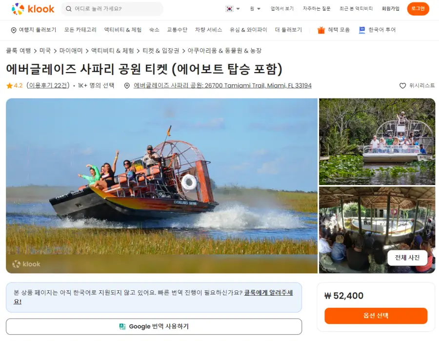 에어보트 탑승 포함 에버글레이즈 사파리 공원 티켓은 클룩사이트에서 쉽게 예약하실 수 있으며, 현재 할인된 금액에 이용하실 수 있습니다.