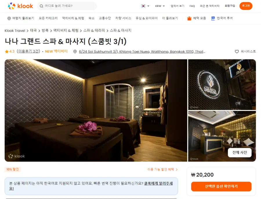 Grand Massage & Spa Nana (Sukhumvit 3/1)의 경우, 제3자 업체를 통한 예약시 예약 수용 인원에 제한이 있고, 예약 시간대가 보장되지 않습니다. 수월한 예약 확정 및 선호하는 시간대 확보를 위해 직접 예약을 진행하실 것을 권장합니다.