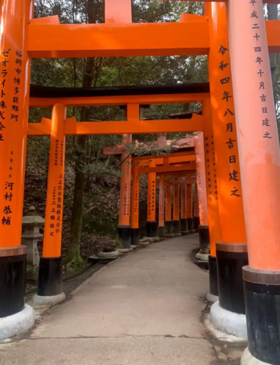 후시미 이나리 신사의 가장 독특한 특징은 아마도 그 수많은 붉은 토리 게이트일 것입니다. 이 게이트들은 신사의 입구에서부터 산의 정상까지 이어져 있으며, 이를 통과하면서 방문객들은 마치 다른 세계로 들어가는 듯한 느낌을 받게 됩니다. 이 토리 게이트들은 개인이나 기업에 의해 기증받은 것으로, 각 게이트에는 기증자의 이름과 기증 날짜가 적혀 있습니다.
