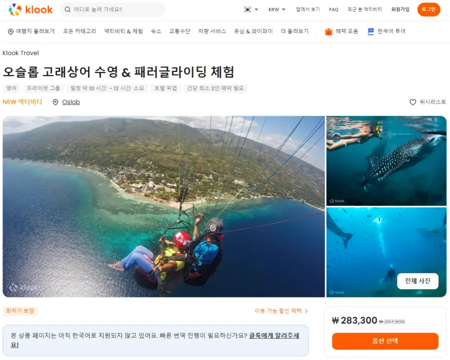 오슬롭 고래상어 수영 및 패러글라이딩 체험은 클룩사이트에서 쉽게 예약하실 수 있으며, 현재 할인된 금액에 이용하실 수 있습니다.