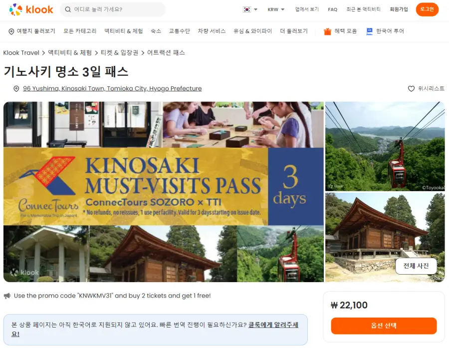 기노사키 명소 3일 패스는 클룩사이트에서 쉽게 예약하실 수 있으며, 현재 할인된 금액에 이용하실 수 있습니다.