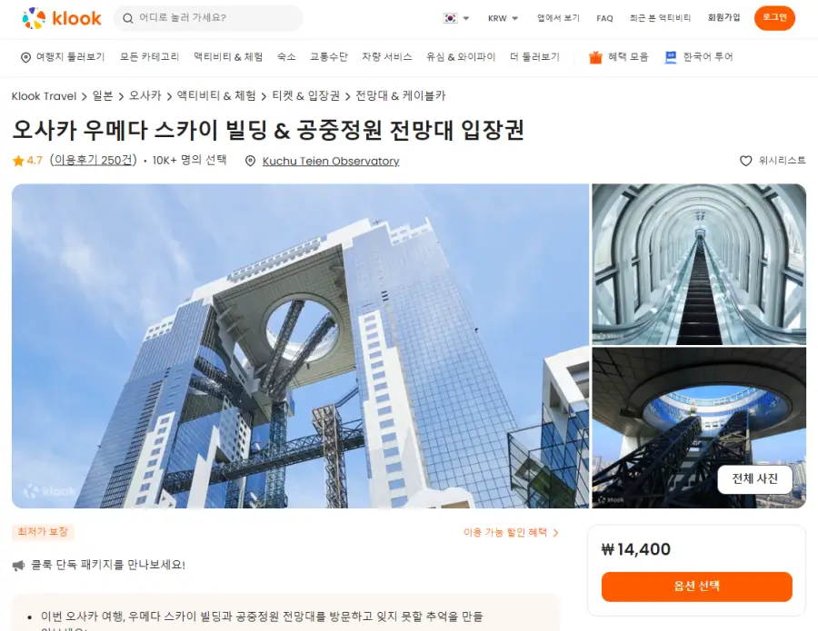 오사카 우메다 스카이 빌딩 & 공중정원 전망대 입장권은 클룩사이트에서 쉽게 예약하실 수 있으며, 현재 할인된 금액에 이용하실 수 있습니다.