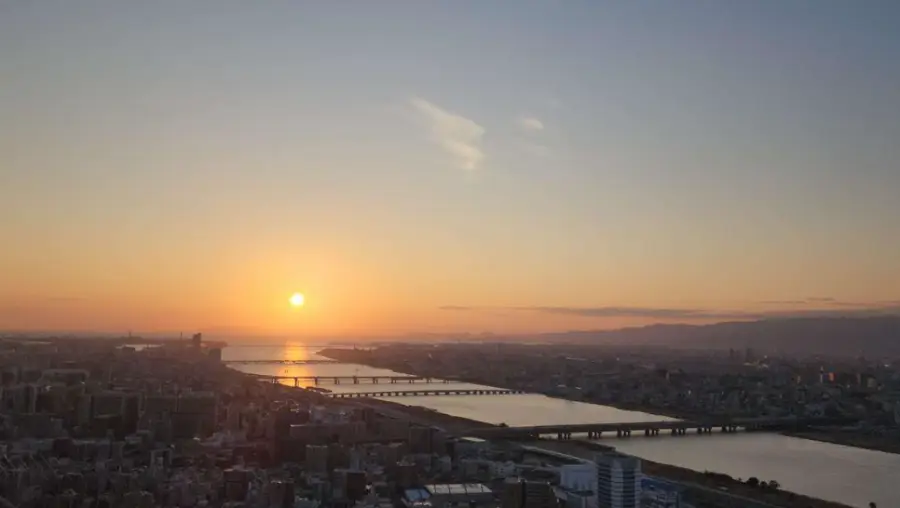 먼저, 일몰 시간에는 오사카 도시 위로 떨어지는 노을이 볼 수 있습니다. 이때의 하늘 색깔과 도시의 빛이 섞이면서 펼쳐지는 경치는 굉장히 아름답습니다. 특히 구름이 많은 날에는 더욱 화려한 일몰을 볼 수 있습니다.