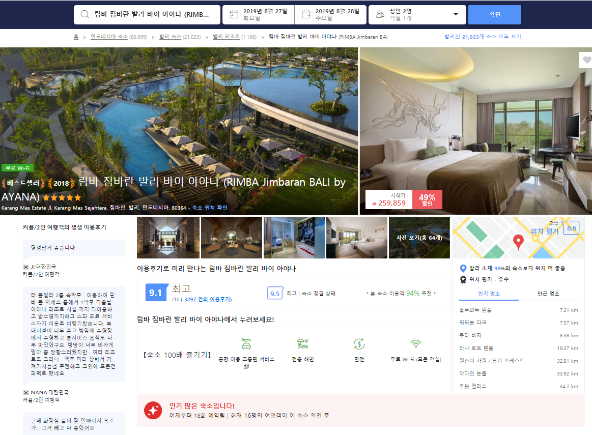 해외 여행에 꼭 필요한 숙박정보로 호텔, 리조트의 가격, 사진, 위치, 후기 등을