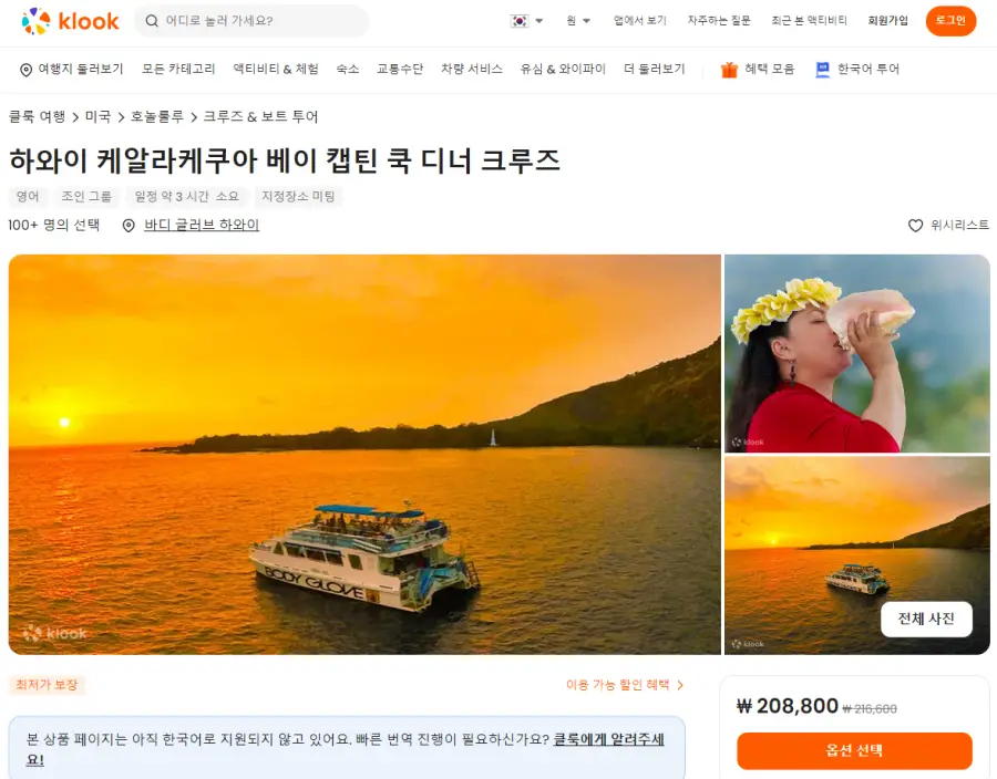 하와이주 빅아일랜드 케알라케쿠아 베이 캡틴 쿡 디너 크루즈는 클룩사이트에서 쉽게 예약하실 수 있으며, 현재 할인된 금액에 이용하실 수 있습니다.