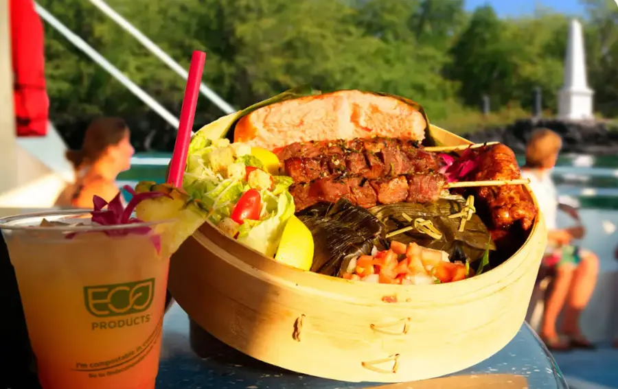 Kealakekua Bay에서 섬 스타일의 뷔페를 즐기십시오. 모든 음식 재료는 현지 농부와 현지 생산자로부터 나옵니다.