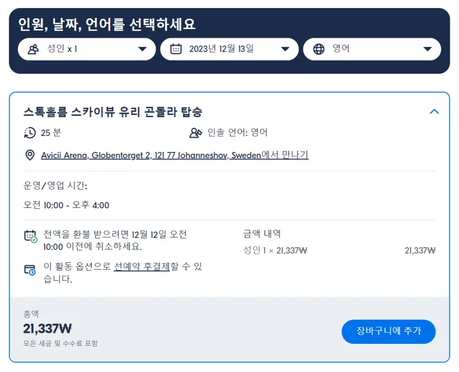 스카이뷰 유리 곤돌라는 에릭스다르이 경기장 내에 위치해 있어, 경기장 입장료를 내고 곤돌라를 이용할 수 있습니다. 이는 경기장을 방문하는 관광객들에게 스톡홀름의 아름다운 풍경을 즐기는 절호의 기회를 제공합니다.