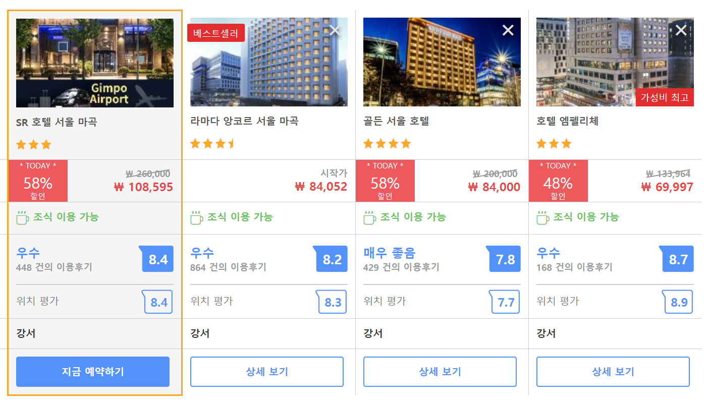SR 호텔 서울 마곡 (SR Hotel Seoul Magok)의 최저 가격대는 아고다에서 할인특가 가격으로 매일매일 변동되며 20만원대부터 다양하게 형성됩니다. 아고다 최저가를 확인하시려면 아래 링크를 누르시면 원하는 날짜의 가격대를 자세히 보실 수 있습니다.