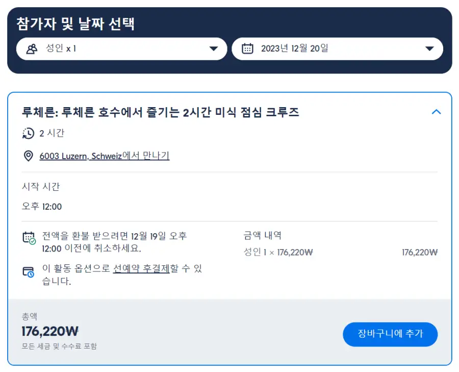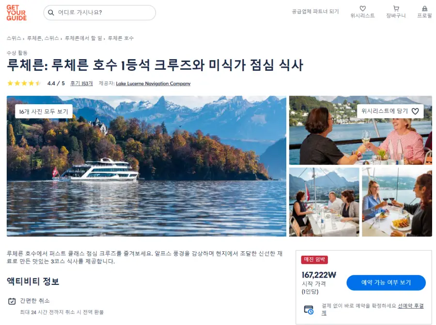 루체른여행의 루체른 호수 1등석 크루즈와 미식가 점심 식사 패키지 현지투어는 GET YOUR GUIDE 사이트에서 예약하실 수 있습니다. 사이트는 특히 전세계 대부분의 나라, 지역의 투어, 교통편 있어, 쉽게 찾을 수 없는 여행지의 다양한 투어 및 서비스를 이용할 수 있는 글로벌 사이트로 한국어사이트는 지원하지 않습니다. (글로벌 한국어 여행사이트를 찾으신다면 klook 여행사이트 추천합니다. 함께 사용하시면 더욱 편하게 여행하실 수 있습니다. klook에 찾는 정보가 없다면 GET YOUR GUIDE에서 찾으시면 됩니다.)