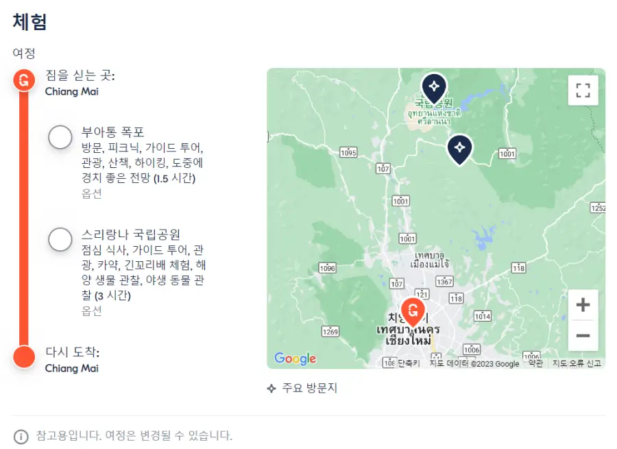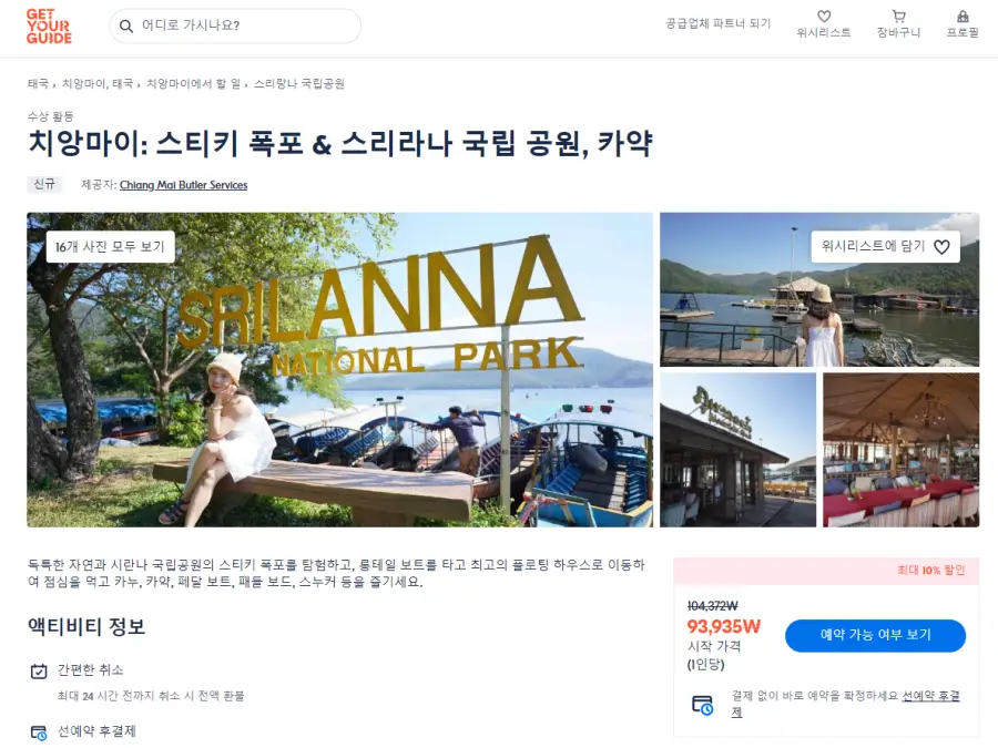 치앙마이출발 스티키 폭포(부아통폭포) & 스리라나 국립 공원 현지투어는 GET YOUR GUIDE 사이트에서 예약하실 수 있습니다. 사이트는 특히 전세계 대부분의 나라, 지역의 투어, 교통편 있어, 쉽게 찾을 수 없는 여행지의 다양한 투어 및 서비스를 이용할 수 있는 글로벌 사이트로 한국어사이트는 지원하지 않습니다. (글로벌 한국어 여행사이트를 찾으신다면 klook 여행사이트 추천합니다. 함께 사용하시면 더욱 편하게 여행하실 수 있습니다. klook에 찾는 정보가 없다면 GET YOUR GUIDE에서 찾으시면 됩니다.)
