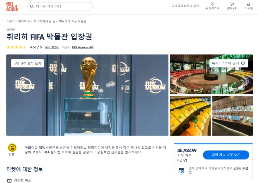 취리히 FIFA 박물관 입장권은 GET YOUR GUIDE 사이트에서 예약하실 수 있습니다. 사이트는 특히 전세계 대부분의 나라, 지역의 투어, 교통편 있어, 쉽게 찾을 수 없는 여행지의 다양한 투어 및 서비스를 이용할 수 있는 글로벌 사이트로 한국어사이트는 지원하지 않습니다. (글로벌 한국어 여행사이트를 찾으신다면 klook 여행사이트 추천합니다. 함께 사용하시면 더욱 편하게 여행하실 수 있습니다. klook에 찾는 정보가 없다면 GET YOUR GUIDE에서 찾으시면 됩니다.)
