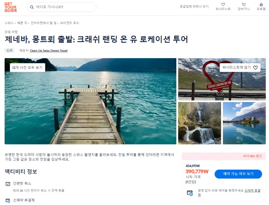 유명한 한국 드라마 사랑의 불시착(크래쉬 랜딩 온 유)의 웅장한 스위스 촬영지를 둘러보세요. 전일 투어를 통해 인터라켄 지역에서 가장 그림 같은 장소와 전망을 감상하세요.