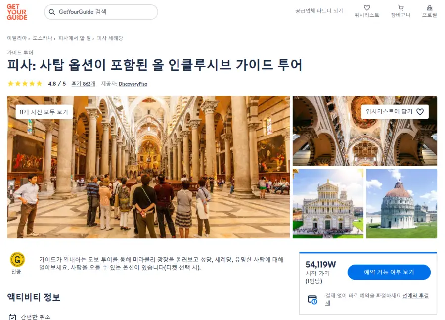 피사의 사탑 가이드 투어 또는 입장권만 구매하실 수 있으며 GET YOUR GUIDE 사이트에서 예약하실 수 있습니다. 사이트는 특히 전세계 대부분의 나라, 지역의 투어, 교통편 있어, 쉽게 찾을 수 없는 여행지의 다양한 투어 및 서비스를 이용할 수 있는 글로벌 사이트로 한국어사이트는 지원하지 않습니다. (글로벌 한국어 여행사이트를 찾으신다면 klook 여행사이트 추천합니다. 함께 사용하시면 더욱 편하게 여행하실 수 있습니다. klook에 찾는 정보가 없다면 GET YOUR GUIDE에서 찾으시면 됩니다.)