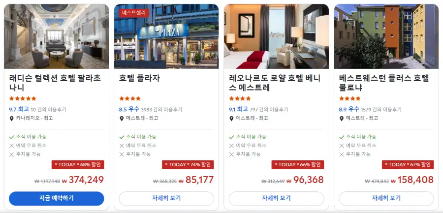 베네치아 래디슨 컬렉션 호텔 팔라초 나니 (Radisson Collection Hotel, Palazzo Nani Venice)의 최저 가격대는 아고다웹사이트에서 할인특가 가격으로 매일매일 변동되며 10만원대부터 다양하게 형성됩니다. 날짜별로 매일 가격이 다르므로 아고다웹사이트 최저가를 확인하시려면 아래 링크를 누르시고 원하는 날짜의 가격대를 선택해야 정확한 가격을 자세히 보실 수 있습니다.