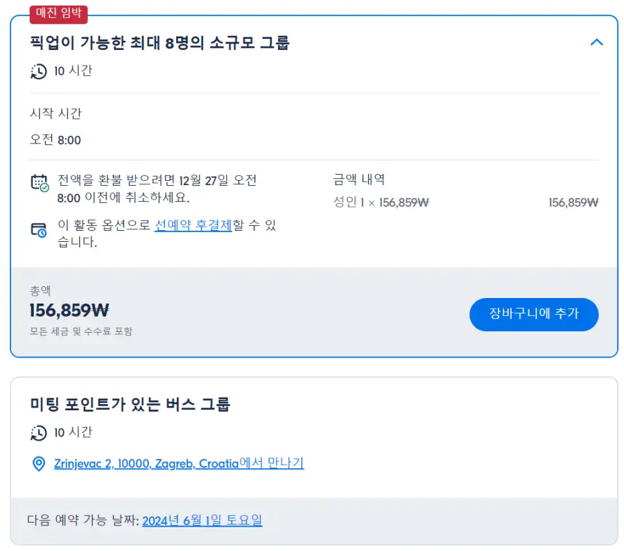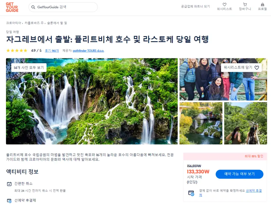 자그레브출발 플리트비체 호수와 라스토케를 둘러보는 현지투어는 GET YOUR GUIDE 사이트에서 예약하실 수 있습니다. 사이트는 특히 전세계 대부분의 나라, 지역의 투어, 교통편 있어, 쉽게 찾을 수 없는 여행지의 다양한 투어 및 서비스를 이용할 수 있는 글로벌 사이트로 한국어사이트는 지원하지 않습니다. (글로벌 한국어 여행사이트를 찾으신다면 klook 여행사이트 추천합니다. 함께 사용하시면 더욱 편하게 여행하실 수 있습니다. klook에 찾는 정보가 없다면 GET YOUR GUIDE에서 찾으시면 됩니다.)