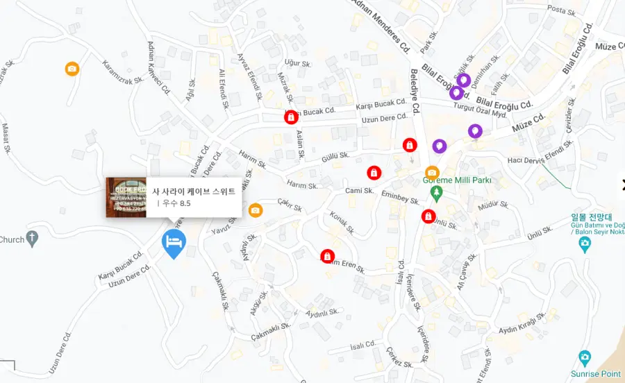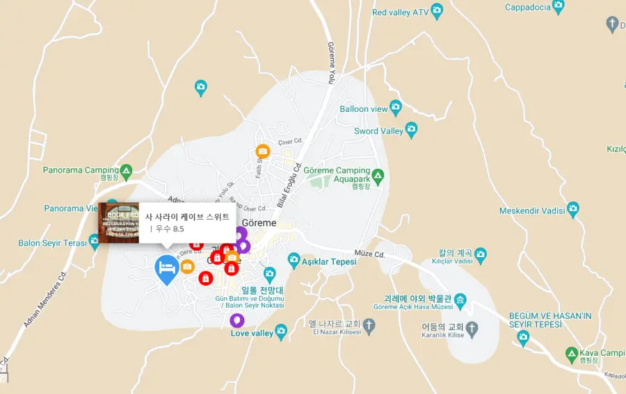 괴레메호텔 사 사라이 케이브 스위트 (SAH SARAY CAVE SUITES)는 괴레메 중심부, Bilal Eroğlu Cd 근처에 위치해 있어 주변 관광지를 쉽게 방문할 수 있습니다. 주변에는 다양한 레스토랑, 카페, 상점이 있으며, 독특한 캐파도키아 지형을 감상할 수 있는 최적의 위치에 있습니다.