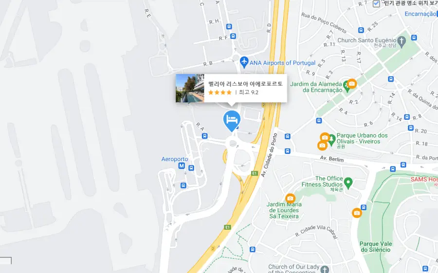 리스본 국제공항에서 도보로 이용가능하고 지하철이용시 시내까지 갈수있어서 좋아요