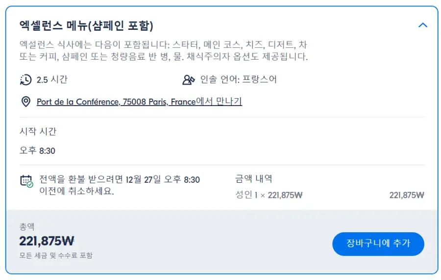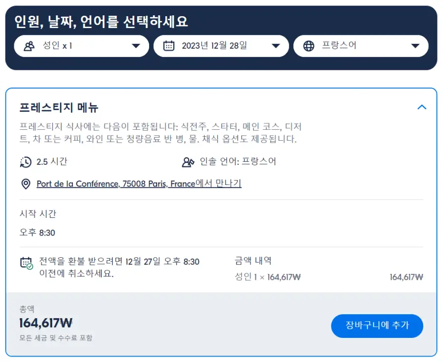 파리 크루즈추천 4코스 디너 센강 유람선 예약은 GET YOUR GUIDE 사이트에서 예약하실 수 있습니다. 사이트는 특히 전세계 대부분의 나라, 지역의 투어, 교통편 있어, 쉽게 찾을 수 없는 여행지의 다양한 투어 및 서비스를 이용할 수 있는 글로벌 사이트로 한국어사이트는 지원하지 않습니다. (글로벌 한국어 여행사이트를 찾으신다면 klook 여행사이트 추천합니다. 함께 사용하시면 더욱 편하게 여행하실 수 있습니다. klook에 찾는 정보가 없다면 GET YOUR GUIDE에서 찾으시면 됩니다.)