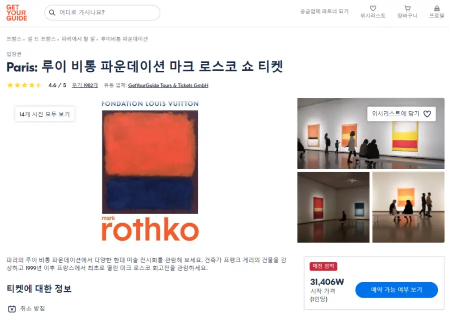 파리 루이 비통 파운데이션 마크 로스코 쇼 티켓은 GET YOUR GUIDE 사이트에서 예약하실 수 있습니다. 사이트는 특히 전세계 대부분의 나라, 지역의 투어, 교통편 있어, 쉽게 찾을 수 없는 여행지의 다양한 투어 및 서비스를 이용할 수 있는 글로벌 사이트로 한국어사이트는 지원하지 않습니다. (글로벌 한국어 여행사이트를 찾으신다면 klook 여행사이트 추천합니다. 함께 사용하시면 더욱 편하게 여행하실 수 있습니다. klook에 찾는 정보가 없다면 GET YOUR GUIDE에서 찾으시면 됩니다.)