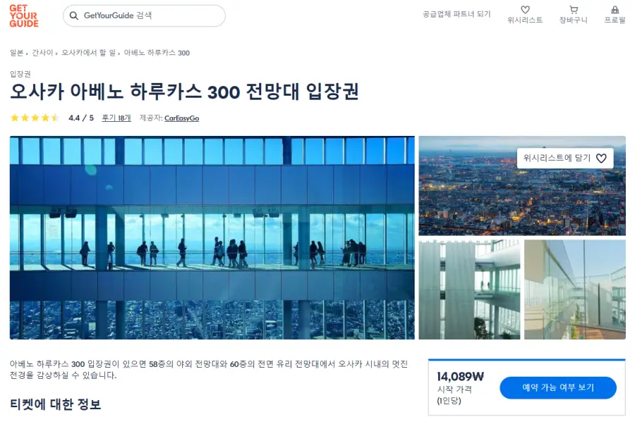 오사카 아베노 하루카스 300 전망대 입장권은 GET YOUR GUIDE 사이트에서 예약하실 수 있습니다. 사이트는 특히 전세계 대부분의 나라, 지역의 투어, 교통편 있어, 쉽게 찾을 수 없는 여행지의 다양한 투어 및 서비스를 이용할 수 있는 글로벌 사이트로 한국어사이트는 지원하지 않습니다. (글로벌 한국어 여행사이트를 찾으신다면 klook 여행사이트 추천합니다. 함께 사용하시면 더욱 편하게 여행하실 수 있습니다. klook에 찾는 정보가 없다면 GET YOUR GUIDE에서 찾으시면 됩니다.)