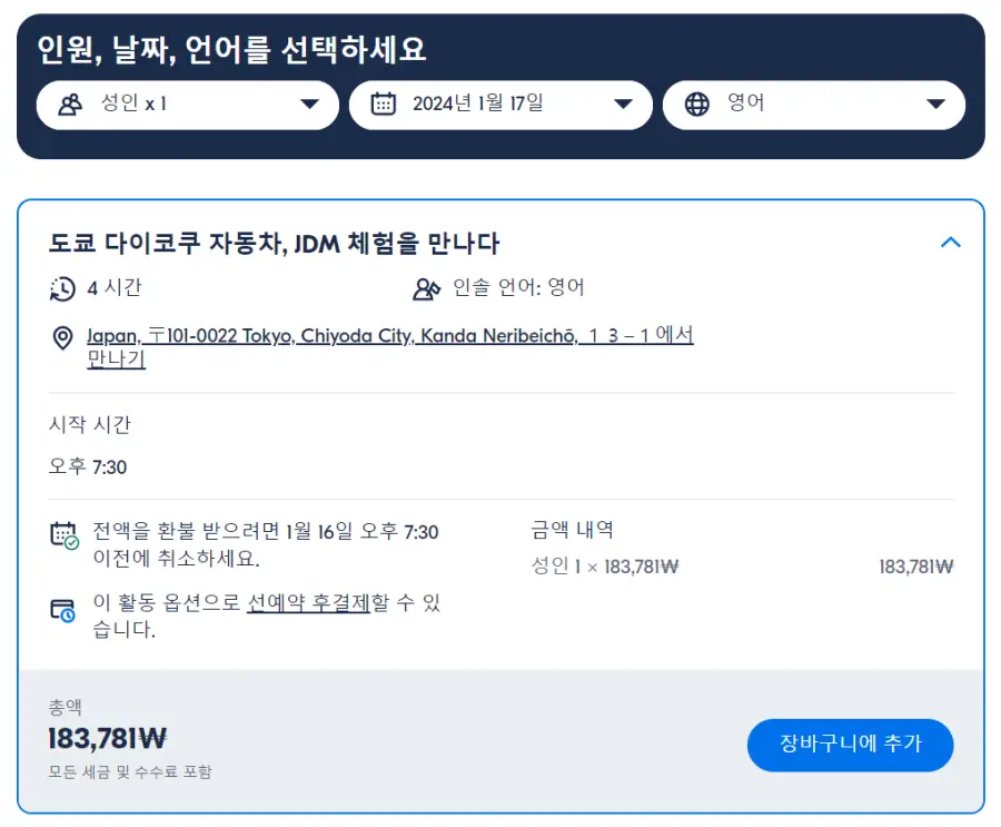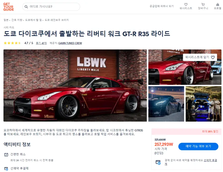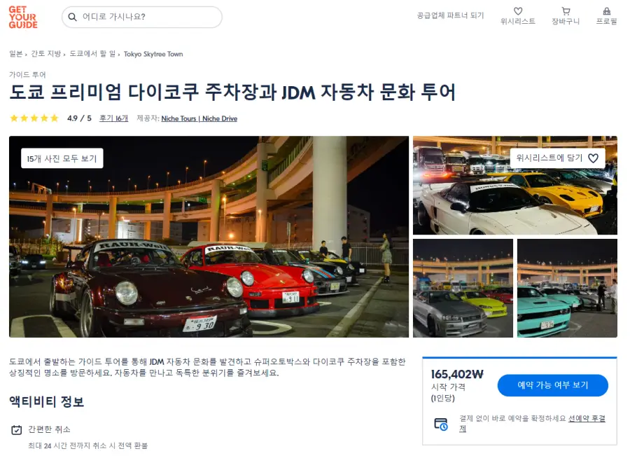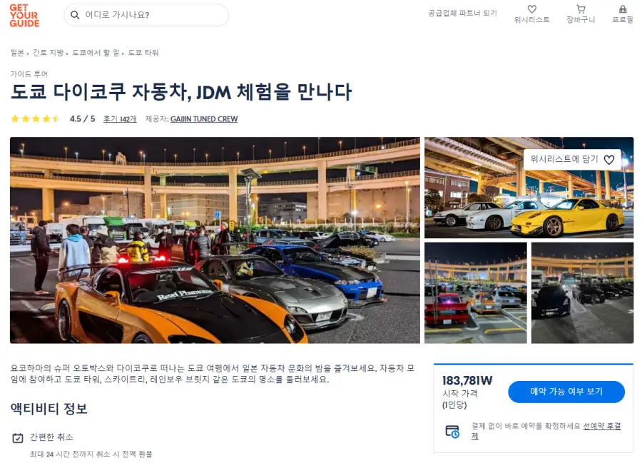 도쿄 다이코쿠 자동차, JDM 체험 현지투어는 GET YOUR GUIDE 사이트에서 예약하실 수 있습니다. 사이트는 특히 전세계 대부분의 나라, 지역의 투어, 교통편 있어, 쉽게 찾을 수 없는 여행지의 다양한 투어 및 서비스를 이용할 수 있는 글로벌 사이트로 한국어사이트는 지원하지 않습니다. (글로벌 한국어 여행사이트를 찾으신다면 klook 여행사이트 추천합니다. 함께 사용하시면 더욱 편하게 여행하실 수 있습니다. klook에 찾는 정보가 없다면 GET YOUR GUIDE에서 찾으시면 됩니다.)