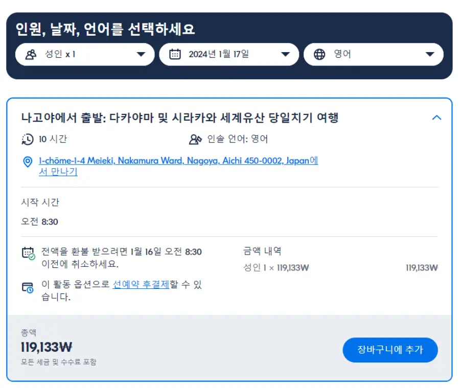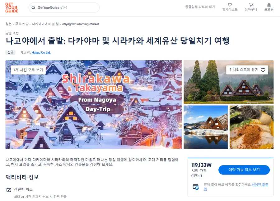 나고야출발 다카야마와 시라카와 현지투어는 GET YOUR GUIDE 사이트에서 예약하실 수 있습니다. 사이트는 특히 전세계 대부분의 나라, 지역의 투어, 교통편 있어, 쉽게 찾을 수 없는 여행지의 다양한 투어 및 서비스를 이용할 수 있는 글로벌 사이트로 한국어사이트는 지원하지 않습니다. (글로벌 한국어 여행사이트를 찾으신다면 klook 여행사이트 추천합니다. 함께 사용하시면 더욱 편하게 여행하실 수 있습니다. klook에 찾는 정보가 없다면 GET YOUR GUIDE에서 찾으시면 됩니다.)