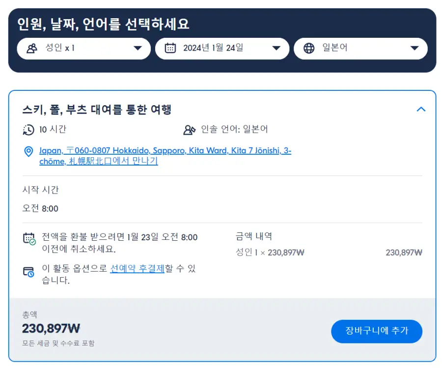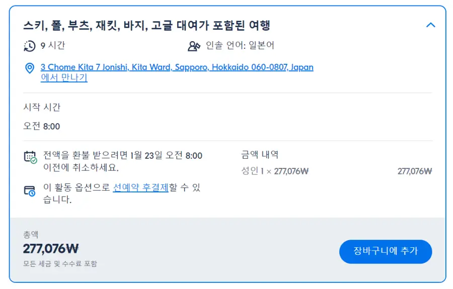 삿포로출발 삿포르 국제 스키 리조트 당일치기 현지투어는 GET YOUR GUIDE 사이트에서 예약하실 수 있습니다. 사이트는 특히 전세계 대부분의 나라, 지역의 투어, 교통편 있어, 쉽게 찾을 수 없는 여행지의 다양한 투어 및 서비스를 이용할 수 있는 글로벌 사이트로 한국어사이트는 지원하지 않습니다. (글로벌 한국어 여행사이트를 찾으신다면 klook 여행사이트 추천합니다. 함께 사용하시면 더욱 편하게 여행하실 수 있습니다. klook에 찾는 정보가 없다면 GET YOUR GUIDE에서 찾으시면 됩니다.)